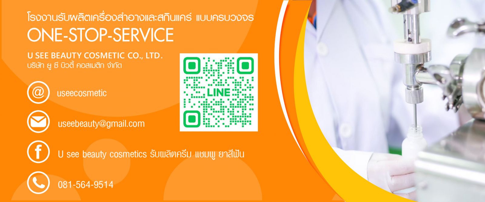 เป็นผู้ผลิตสินค้าสกินแคร์ ผลิตภัณฑ์ดูแลเส้นผมและเครื่องสำอางทุกชนิด ด้วยประสบการณ์ในด้านการรับผลิตเครื่องสำอางมากกว่า 9 ปี ทางบริษัทมีสูตรให้ลูกค้าเลือกผลิตสินค้าได้อย่างหลากหลาย ด้วยมาตรฐานของโรงงาน และการควบคุมคุณภาพอย่างพิถีพิถันทุกขั้นตอนการผลิต เราจึงได้รับมาตรฐานจากการรับรองการผลิตเครื่องสำอางในระบบสากลจาก GMP อีกทั้งเรายังมีทีมวิจัยทางด้านสกินแคร์ และเครื่องสำอางเข้ามาดูแลในเรื่องการพัฒนาสูตรเครื่องสำอางให้ตรงตามความต้องการของลูกค้า และยังมีทีมด้านการตลาดที่คอยให้คำแนะนำ ดูแลลูกค้า พร้อมให้คำปรึกษาด้านการสร้างแบรนด์สินค้าอย่างถูกต้อง